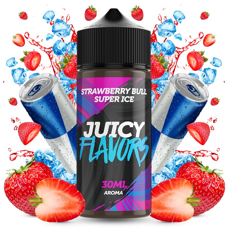El aroma Strawberry Bull Super Ice en formato Longfill de Juicy Flavors captura la esencia de una burbujeante y deliciosa bebida energética con los matices de la dulce y jugosa fresa, todo ello coronado con un toque de frescor intenso.